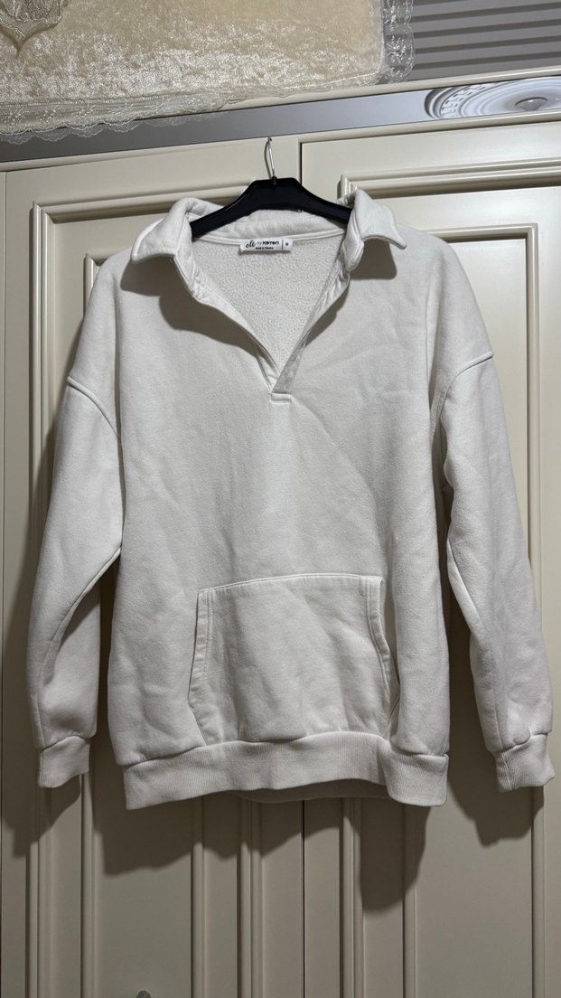 Kadınlar için beyaz polo yaka uzun kollu sweatshirt, bol kesim ve yumuşak sıcak kumaştan. Ön cep detaylı, günlük rahat sokak stili için uygundur.