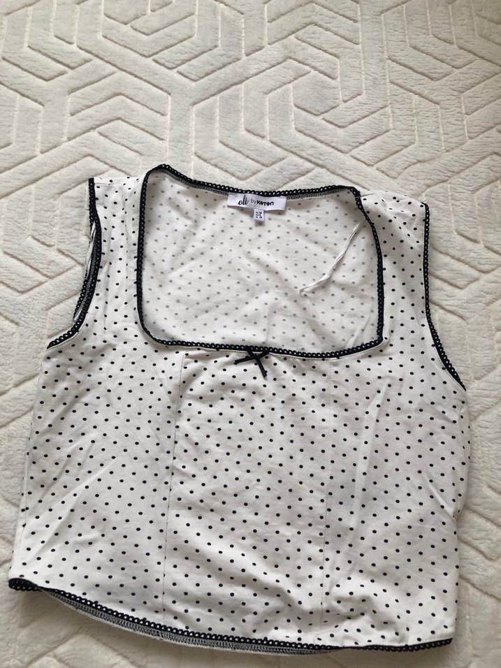 Beyaz kolsuz bluz, siyah puantiyeler ve dantel detaylarla, tekne yakalı ve vücuda oturan kesim, yumuşak sentetik kumaştan üretilmiştir temiz