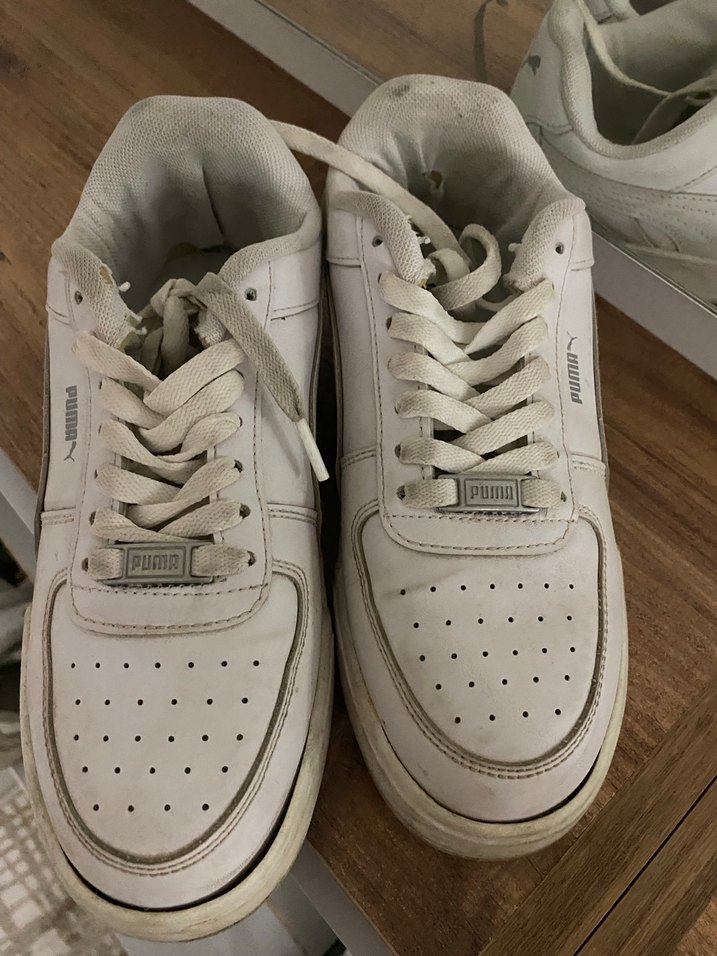Bağcıklı beyaz Puma kadın spor ayakkabısı, düz kauçuk tabanlıdır. Sokak tarzı ve günlük kullanım için uygundur, desensiz ve gri detaylara sahiptir. Ön tarafı hafif çıkmıştır.