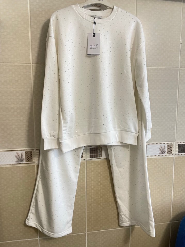 Kadınlar için beyaz, rahat kesim eşofman takımıdır. Uzun kollu, yuvarlak yakalı ve yumuşak sentetik kumaştan yapılmıştır. Günlük kullanıma uygun şık ve rahat bir görünüm sunar.