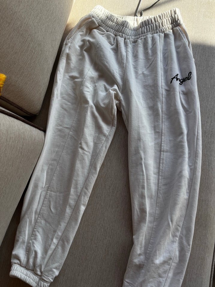 Yumuşak keten kumaştan, rahat kesim beyaz kadın eşofman altı, elastik bel bandı ve 'Angel' nakış detaylı. Günlük rahat kullanım için uygundur.