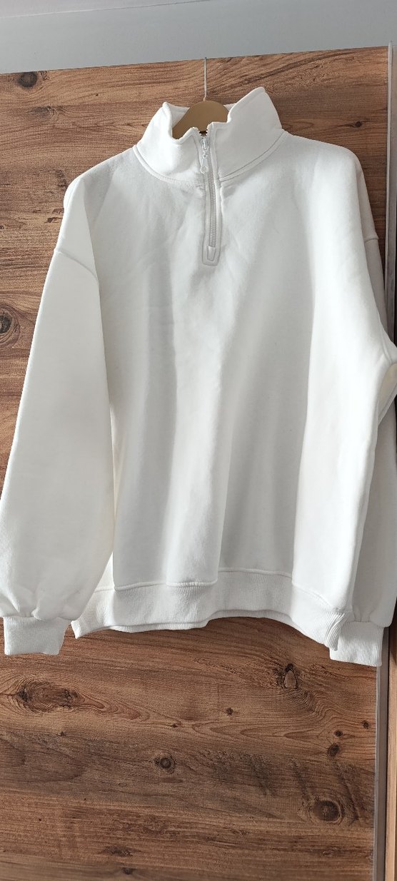 Uzun kollu, yuvarlak yakalı, beyaz rahat kesim sweatshirt. Yumuşak ve sıcak kumaştan üretilmiş, günlük kullanıma uygun şık ve rahat bir model.