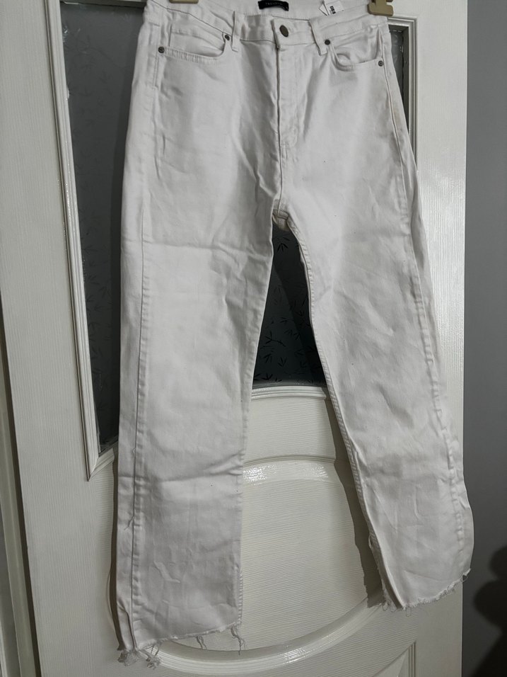 Pamuklu, beyaz kot pantolon, regular fit ve midi boyda. Desensiz, gündelik rahat kullanıma uygun, trend bir casual tarz sunar.
