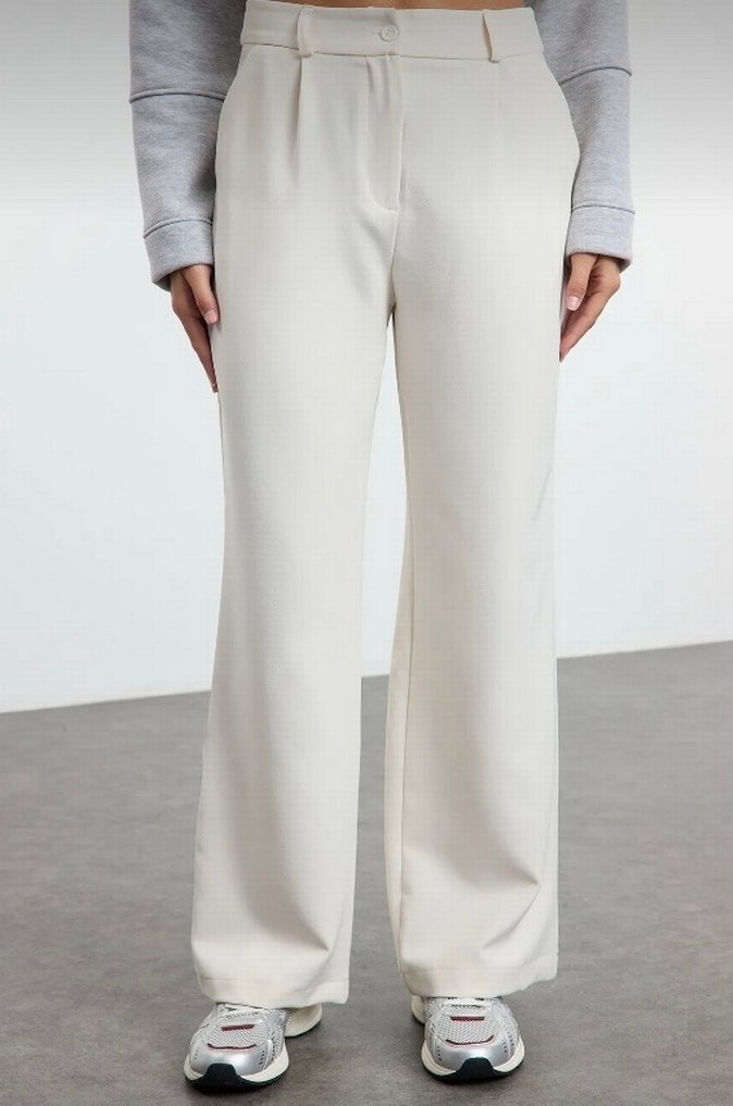 Beyaz, regular fit, midi boy kumaş pantolon. Düz ve minimalist tasarım, ofis için uygun, rahat ve şık. ✨