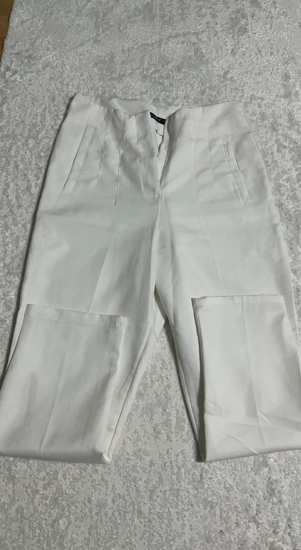 Kadın beyaz kumaş pantolon, regular fit ve midi boyda, yumuşak pamuk kumaştan üretilmiştir. İş ve ofis ortamları için şık ve rahat bir seçenektir.