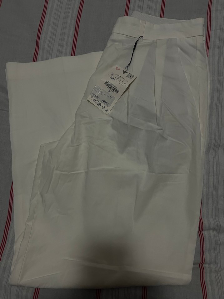 Beyaz, regular fit, midi boy kadın kumaş pantolon. Düz ve sentetik kumaştan, fermuarlı detaylarla günlük rahat sokak stili için uygundur.