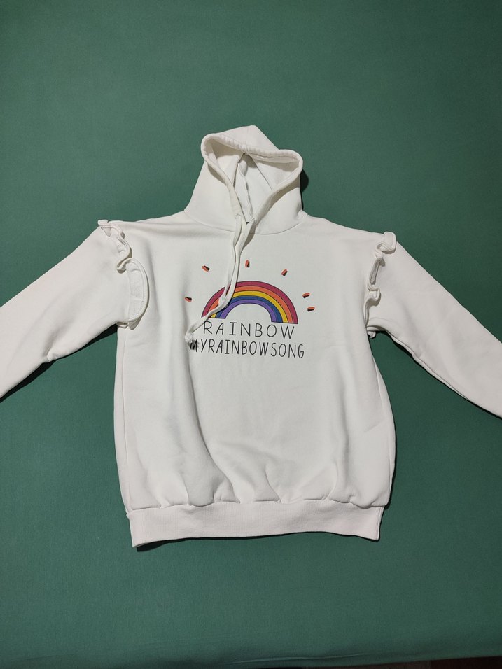 Beyaz renkli, uzun kollu, yuvarlak yakalı ve bol kesim sweatshirt. Yumuşak ve sıcak kumaştan, renkli gökkuşağı baskısı ve kollarında fırfır detayları bulunur. önünde minik bir lekesi var camasır suyu veya leke cıkarıcıyla çıkarılabilir boy 62cm etek ucu 41 cm kol 44 cm