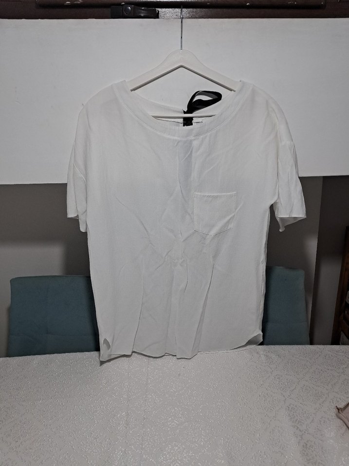 Kadınlar için beyaz keten tişört, kısa kollu ve yuvarlak yakalıdır. Salaş kesimiyle günlük rahat ve şık bir görünüm sunar. Desensiz ve önünde küçük cep detaylıdır. Özellikle sırt dekoltesi çok farklı bir detay