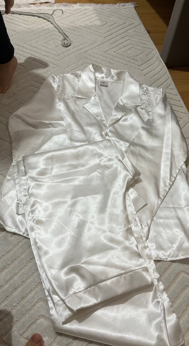 Beyaz saten kumaştan, kısa kollu, bol kesim ve midi boyda kadın pijama takımı. Parlak dokusu ile rahat bir kullanım sunar.