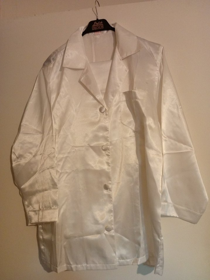 Kadınlar için beyaz, saten görünümlü pijama takımı, Parlak yüzeyi ile düğünlerde şık ve sade bir görünüm sağlar. Minimalist ve desensiz tasarım.