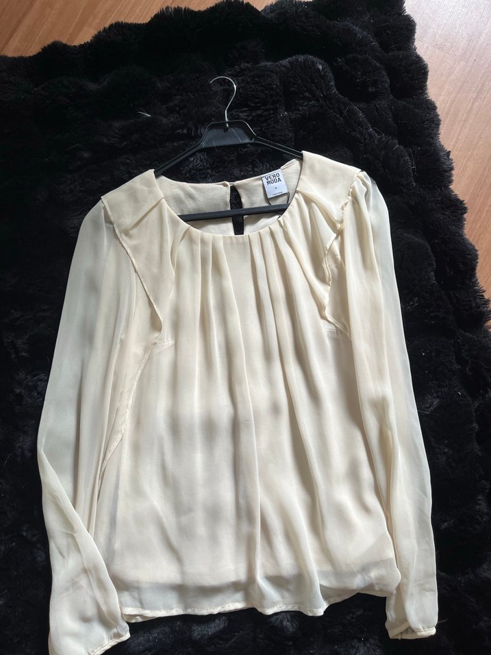 Beyaz saten kumaştan, salaş kesim uzun kollu ve yuvarlak yakalı, midi boyda drapeli kadın bluz, ofis için uygun şık tasarım.