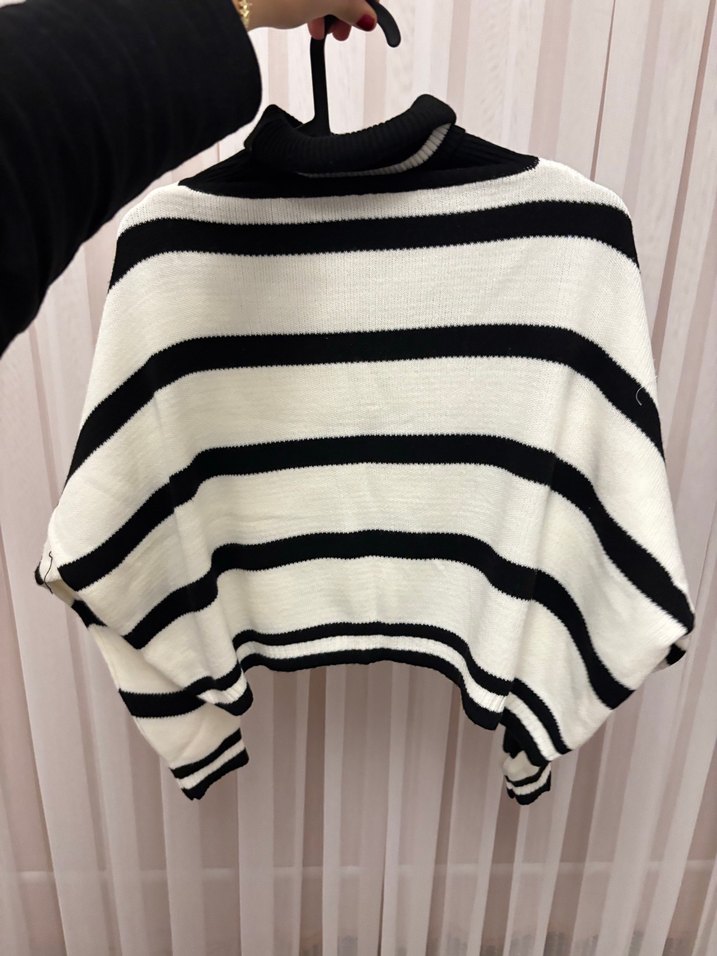 Kadın Beyaz Siyah Çizgili Boğazlı Kazak
