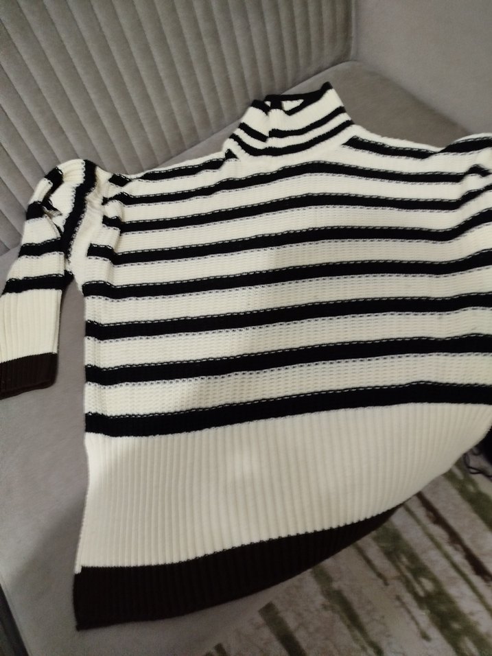 Fitted kesim, boğazlı ve uzun kollu kadın triko kazak, beyaz ve siyah çizgili örgü kumaştan yapılmıştır. Normal midi boyda, trend sokak stiline uygundur. salaştır