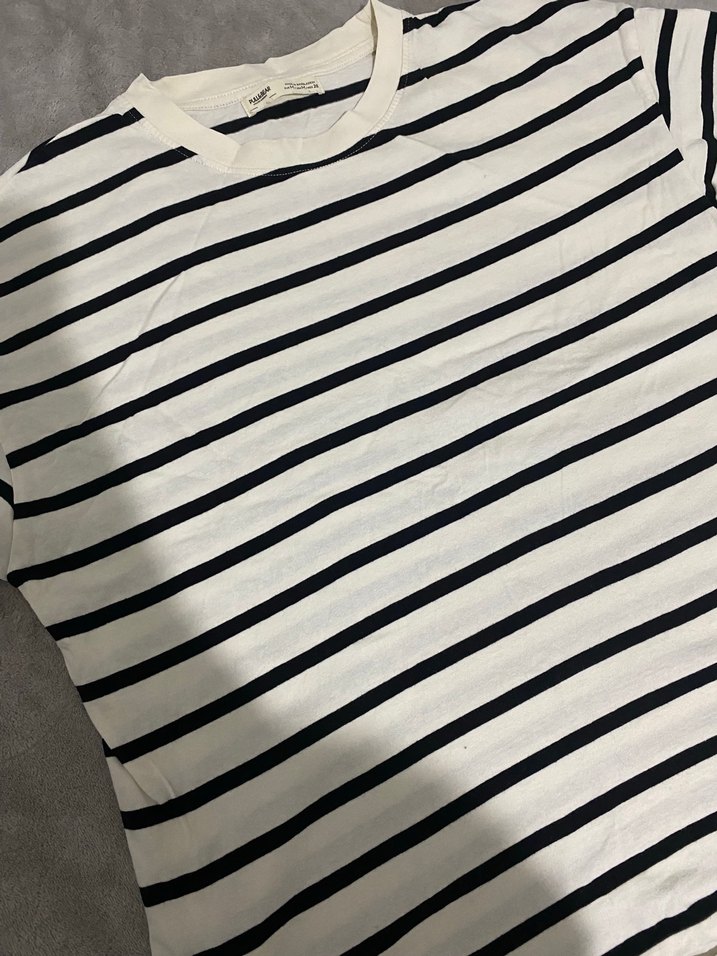Pamuk kumaştan, kayık yakalı ve kısa kollu, beyaz zemin üzerinde koyu çizgili erkek tişörtü. Paris sokak modasını yansıtan, günlük şıklık sunar.