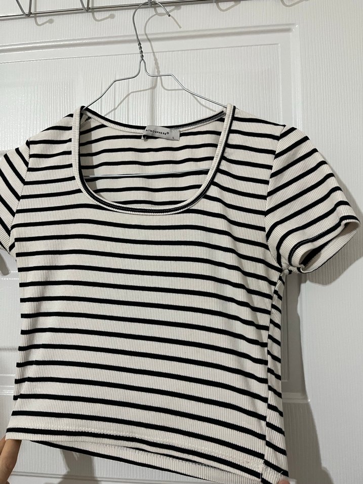 Kadınlar için kısa kollu, tekne yakalı, beyaz ve gri çizgili pamuklu tişört. Kısa boyu ile minimalist ve trend sokak stili sunar.