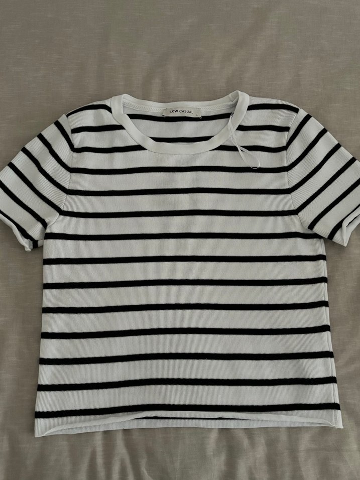 HİÇ GİYİLMEDİ ZATEN FOTOĞRAFTAN BİLE ANLAŞILIYOR YEPYENİ OLDUĞU Pamuklu, kısa kollu ve bisiklet yaka kadın tişörtü, siyah beyaz çizgili deseniyle günlük rahat ve şık bir görünüm sunar.