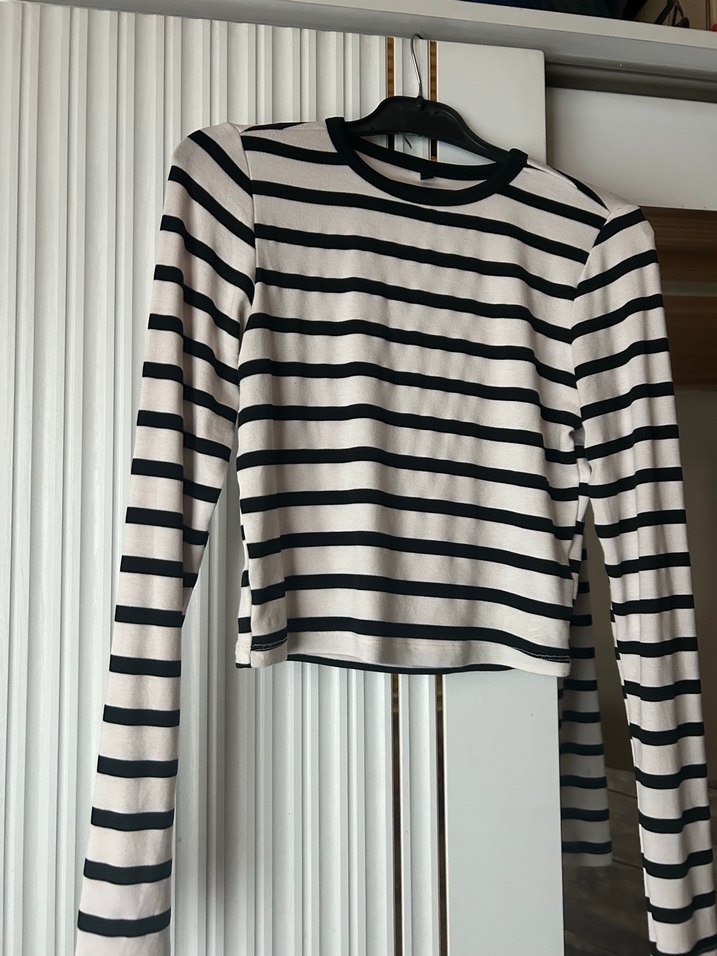 Pamuklu kumaştan, uzun kollu ve fitted kesim beyaz-siyah çizgili triko. Bisiklet yaka ve plise detaylarıyla günlük rahat ve şık bir parça.