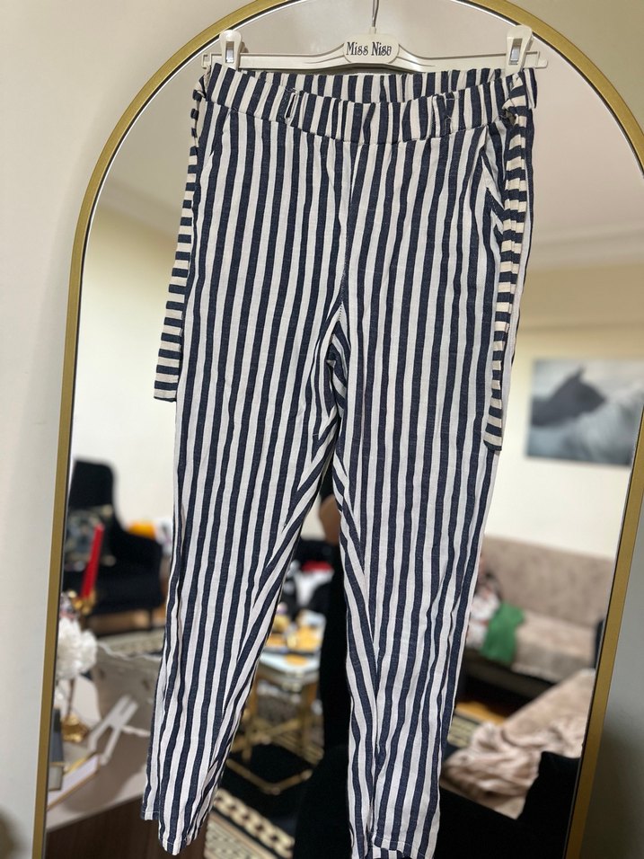 Kadın Beyaz Siyah Çizgili Pilili Pantolon
