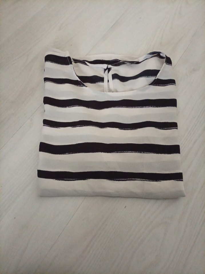 Kadınlar için beyaz ve siyah çizgili, ve kısa kollu bluz. kalın şıfon kumaşıyla gündelik kullanıma uygundur.