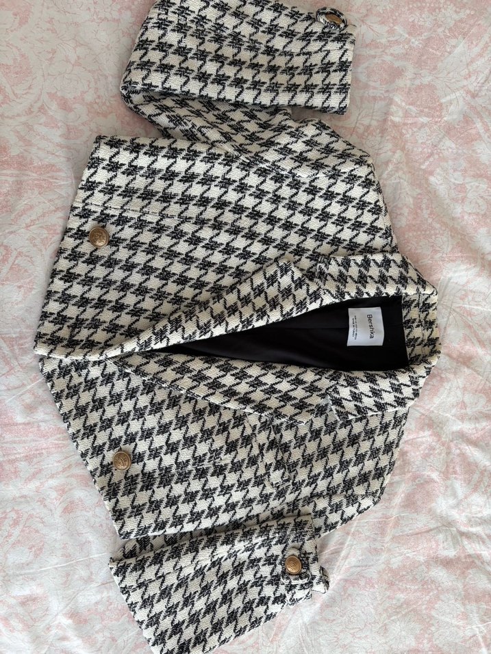 Kadınlar için kısa kesim, klasik yaka ve uzun kollu kazayağı desenli mini ceket. Temizdir Kusuru yoktur