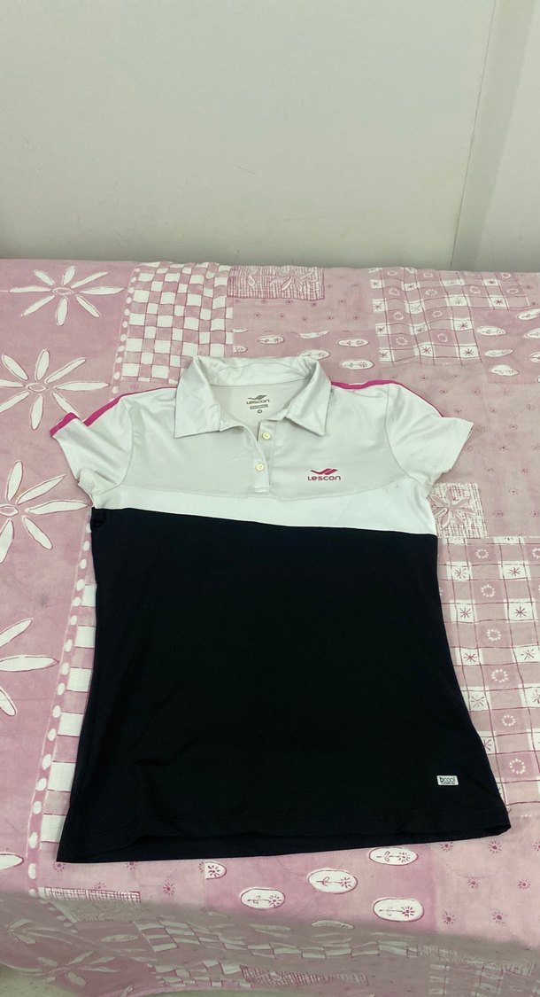 Kadınlar için beyaz ve siyah renk bloklu, polo yaka, kısa kollu, sentetik kumaştan yapılmış dar kesim tişört. Üzerinde baskı ve düğme kapama bulunur. Küçük lekesi mevcut