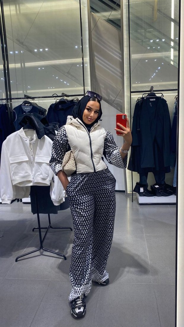 Kadın eşofman takımı, rahat kesim, uzun balon kollu ve yüksek yakalıdır. Sentetik kumaştan üretilmiş, gri beyaz batik desenlidir, günlük kullanım ve sokak stili için uygundur. ️