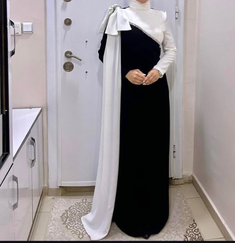 Kadınlar için yüksek yakalı, uzun boylu beyaz drapeli detaylı abiye elbise. Düzenli kesim, minimalist ve çağdaş tasarım, düğünler için uygun. Siyah renkte, desensiz kollu sadece 2 defa giyildi sorunsuzdur.38 bedene uygundur