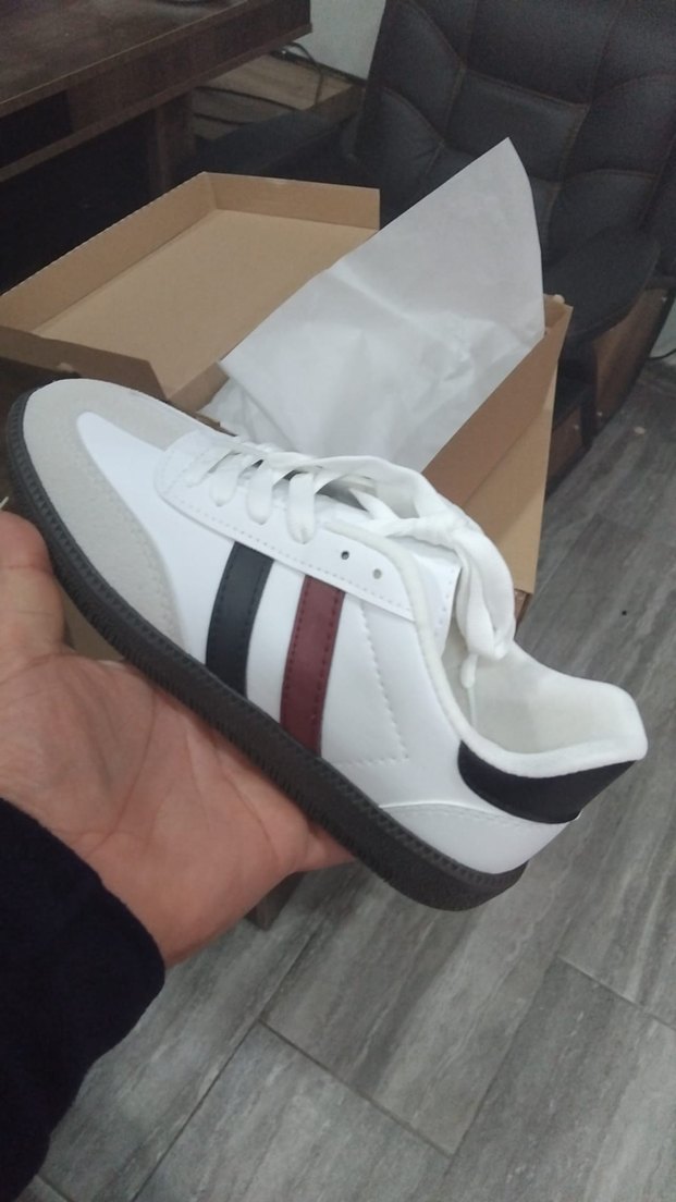 Beyaz kadın spor ayakkabısı, kırmızı ve siyah şerit detaylı, kauçuk tabanlı ve bağcıklı, sportif sokak stili için uygun. 36-37-38-39-40