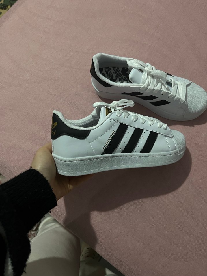 Beyaz tabanlı, siyah baskılı şeritlere sahip kadın spor ayakkabısı. Kauçuk malzemeden, cırt cırtlı, sportif ve günlük kullanım için uygun.