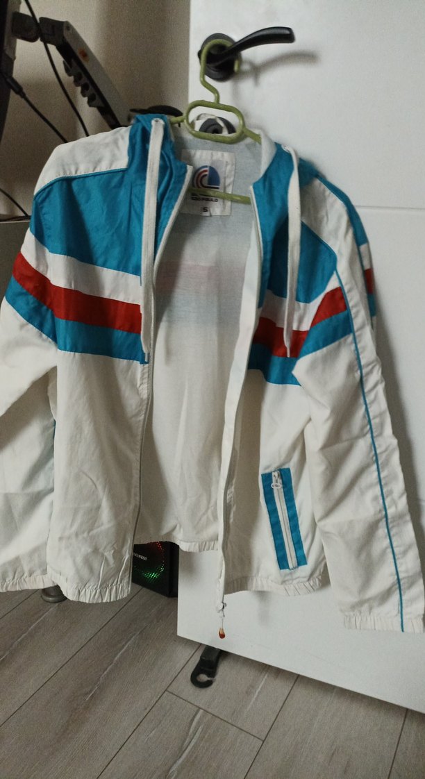 Erkek spor ceketi, uzun kollu ve rahat kesimdir. Sentetik kumaştan yapılmış, fermuarlı cepleri vardır. Beyaz renkli, mavi ve kırmızı şeritlerle dış mekan için uygundur.