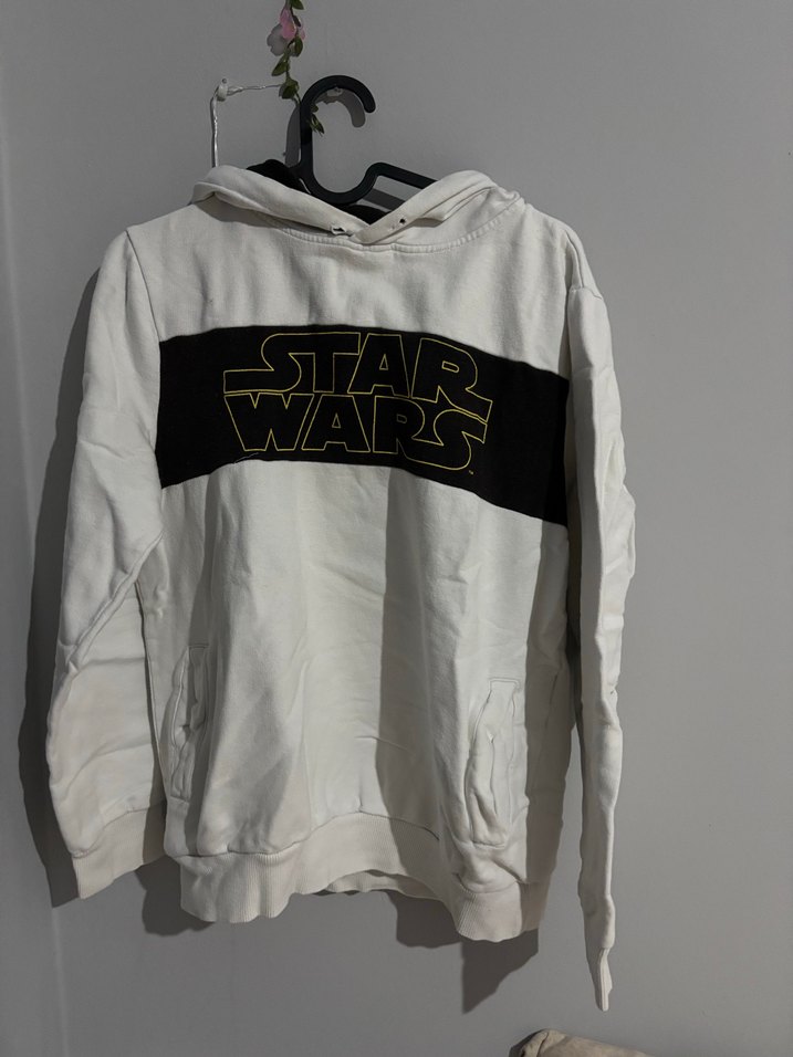 Yumuşak ve sıcak kumaştan, bol kesim beyaz uzun kollu sweatshirt. Star Wars baskılı ve velcro detaylı, bisiklet yaka. Ütüsüz tatlış bi sweatshirt bana küçük geliyo yırtığı yok