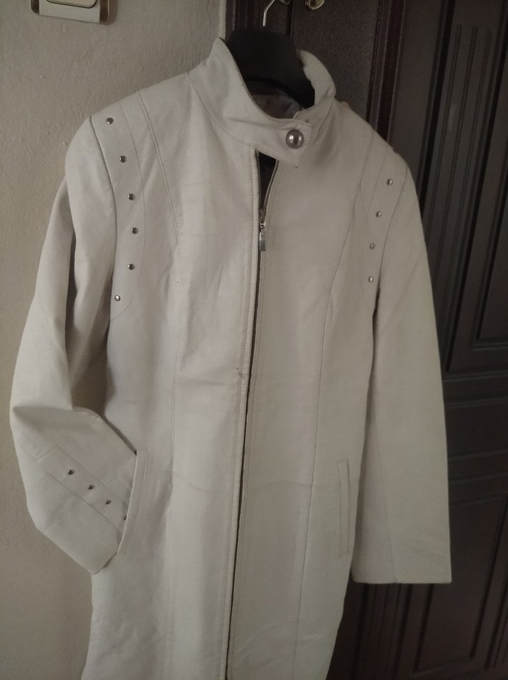 Kadınlar için beyaz süet uzun ceket, düğmeli detaylara sahip, regular fit ve notched lapel yaka ile minimalist sokak stili için uygun. sıfır kullanılmadı eşim alacak karşılığı aldı