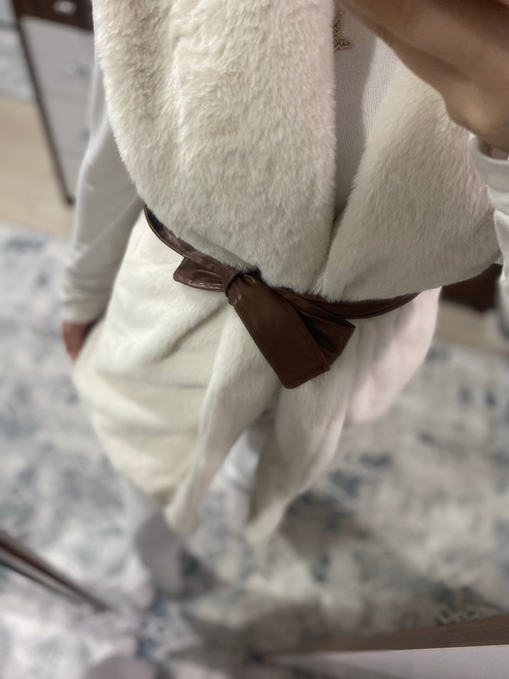 Beyaz suni kürk, bol kesim ve kahverengi kemer bağlamalı yelek. Halter yaka ve askılı kollara sahip, günlük sokak stiline uygun