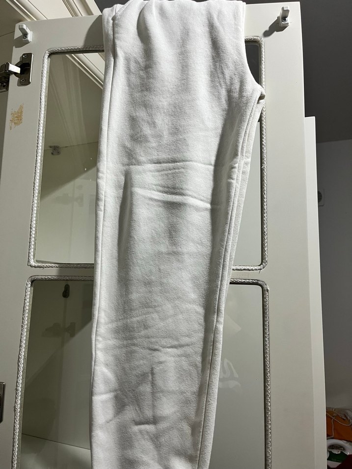 Kadın beyaz sweatpant, rahat regular fit ve midi boyda. Desensiz, günlük sokak stili için uygun, konforlu ve zahmetsiz şıklık sunar.
