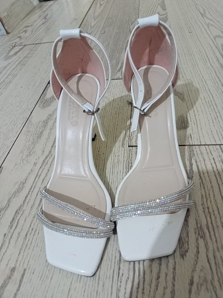 Beyaz, tokalı bilek kayışlı ve ön kısmında taş detaylı topuklu, düğünümde birkaç saat giyindim temiz bir sıkıntısı yok 38 numara