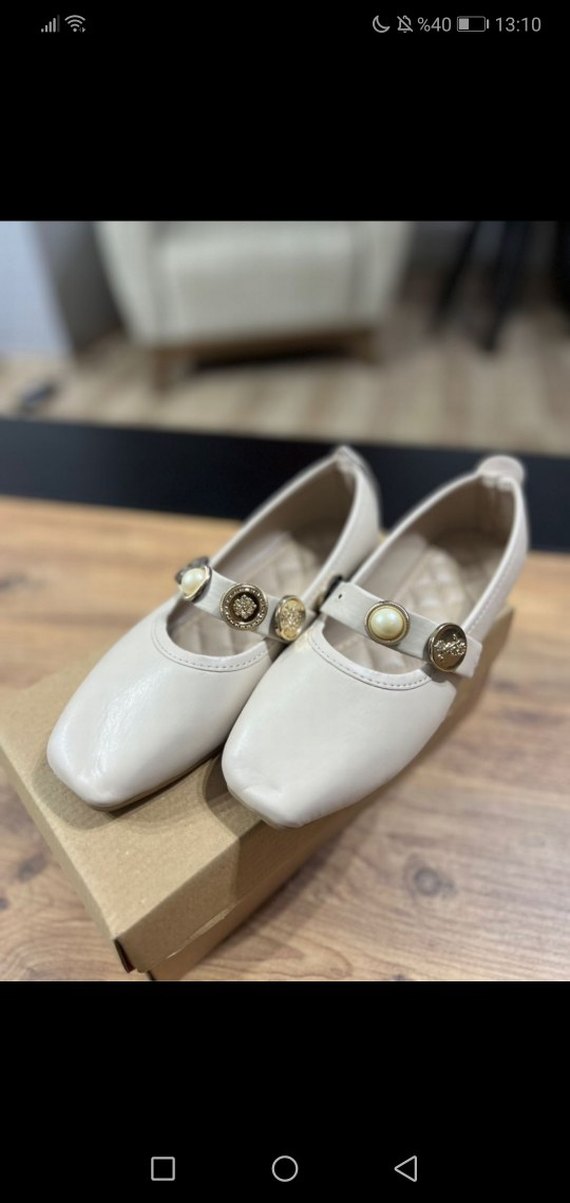 Beyaz blok topuklu, tokalı ve süs düğmeli kadın babet. Kauçuk malzemeden, günlük kullanıma uygun modern klasik tarzda. Tek sıkıntısı bir taşı düşmüş başka bir sorunu yok hiç giyilmedi
