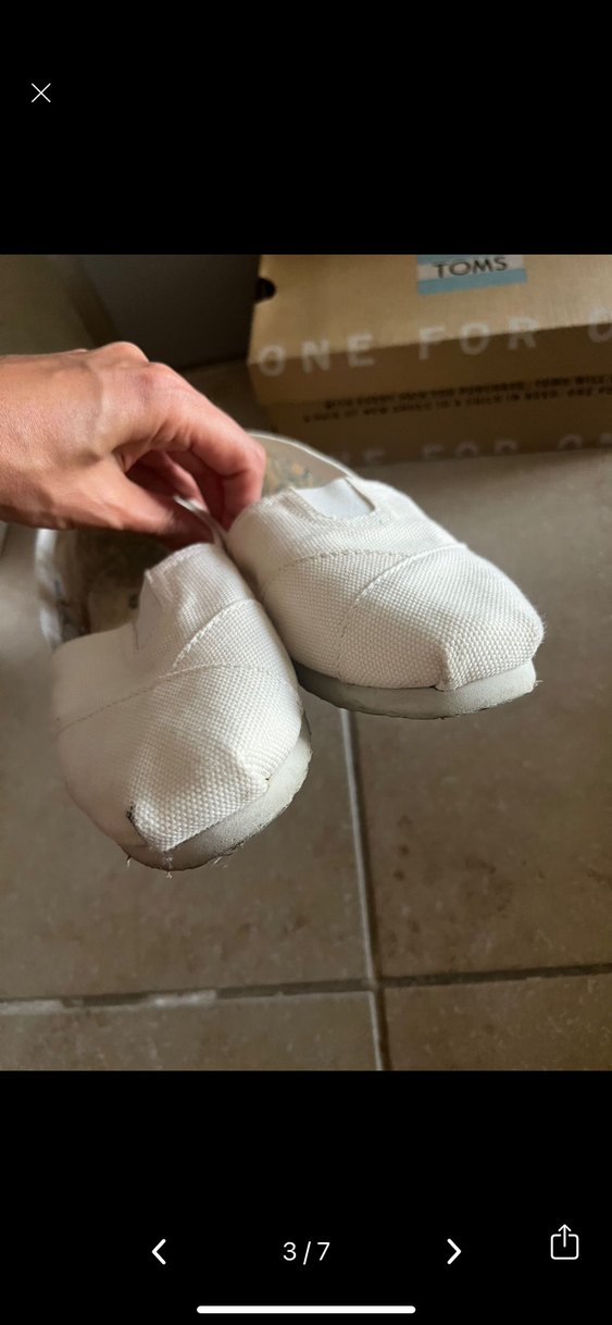 Kadınlar için beyaz TOMS espadriller, dolgu topuk ve cırt cırtlı kapanışa sahip, kauçuk tabanlı. Minimalist, desensiz tasarım, günlük kullanım için uygun.
