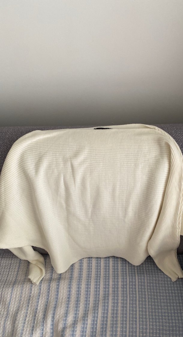 Beyaz renkli, triko dokuma boğazlı ve uzun kollu, bol kesim kadın kazağı. Yumuşak keten kumaştan, günlük kullanıma uygun sade ve rahat tarz. Kolunun birinde ufak bi sökülme var.