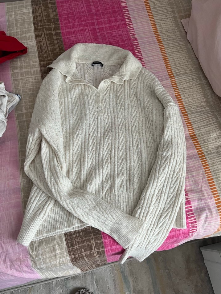 Bu kadın beyaz kazak, örgü dokusu, yakalı ve uzun kollu tasarımıyla dikkat çeker. Salaş kesimi ve normal boyu ile gündelik kullanıma uygundur.
