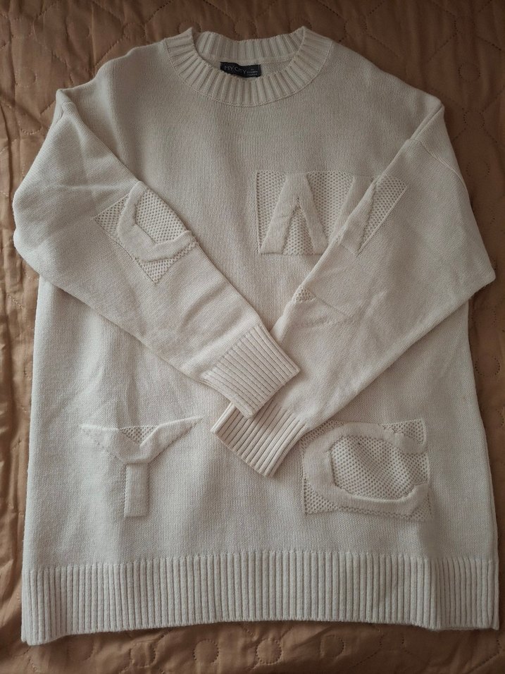 Kadınlar için yuvarlak yakalı, uzun kollu, bol kesim beyaz triko kazak. Yumuşak örgü kumaştan, harf desenli detaylarla sade ve rahat günlük kullanım için uygun.
