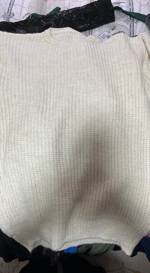 Kadınlar için beyaz renkli, triko örme, salaş kesim ve normal midi boyda kazak. Yumuşak sentetik kumaştan, rahat ve sade normcore tarzda, günlük kullanıma uygun.