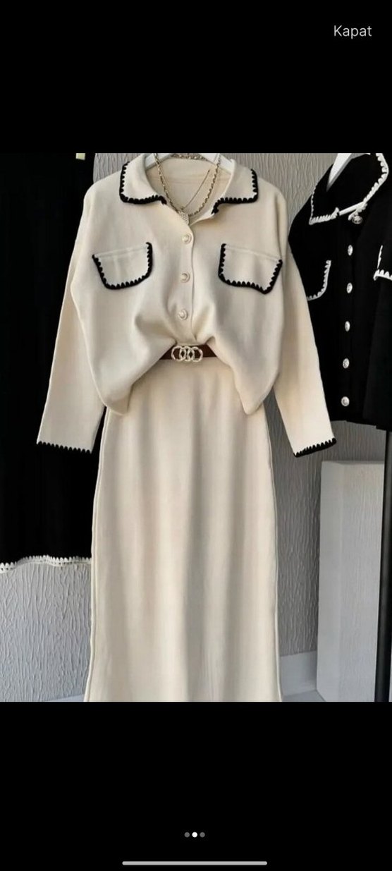 Etek takım bej triko ikili takım uzun kollu ve kesimli yakalıdır. Kemer detaylı, siyah şeritli cepler ve manşetlerle modern klasik tarz sunar. Günlük kullanım için uygundur.