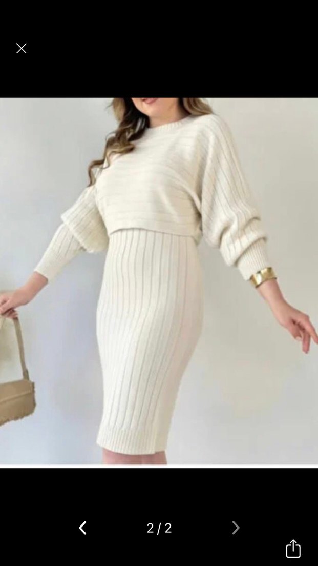 Beyaz renkli, uzun kollu ve bisiklet yaka, yumuşak triko kumaştan yapılmış, vücuda oturan rahat elbise. Günlük kullanıma uygun. Yeni hic giyilmedi