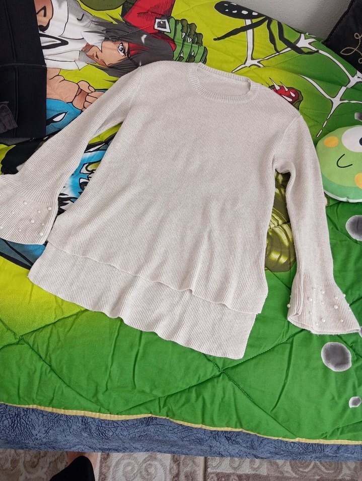 Beyaz örme kazak, uzun kollu ve inci detaylıdır. Rahat kesimiyle günlük kullanıma uygundur.