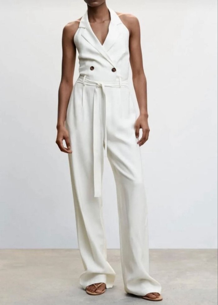 Kolsuz, keten kumaştan yapılmış, kemerli ve kruvaze yakalı beyaz kadın tulumu. Minimalist ve şık, ofis için uygun
