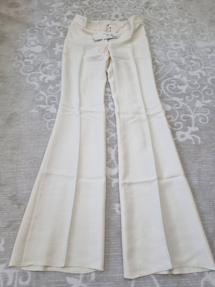Kadınlar için beyaz, uzun dökümlü kumaş pantolon. Regular fit, satenimsi kumaş ve modern, iş ortamına uygun tasarım.