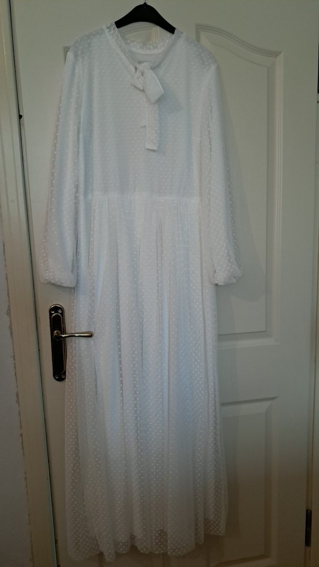 Beyaz uzun piliseli elbise, uzun kollu ve yuvarlak yaka. Rahat kesimli, yumuşak sentetik kumaştan, sade ve mütevazı tarzlar için uygun, düğün için ideal.