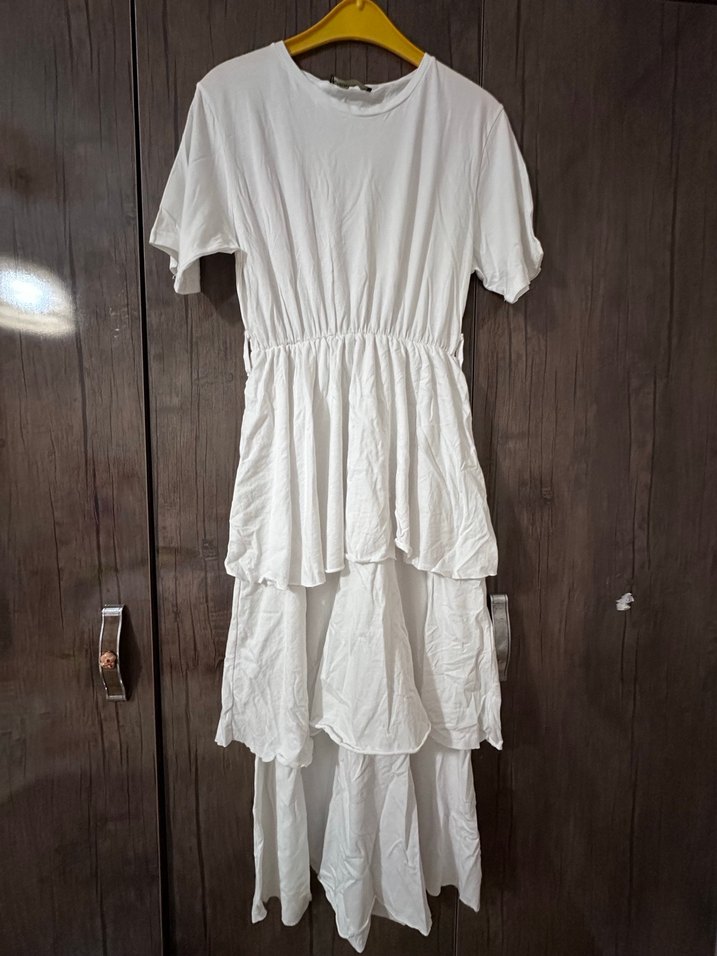 Kadın uzun katlı elbise, kısa kollu ve yuvarlak yakalıdır. Bol kesim ve fırfır detaylarıyla bohem tarzı sunar. Kemer kullanılabilir