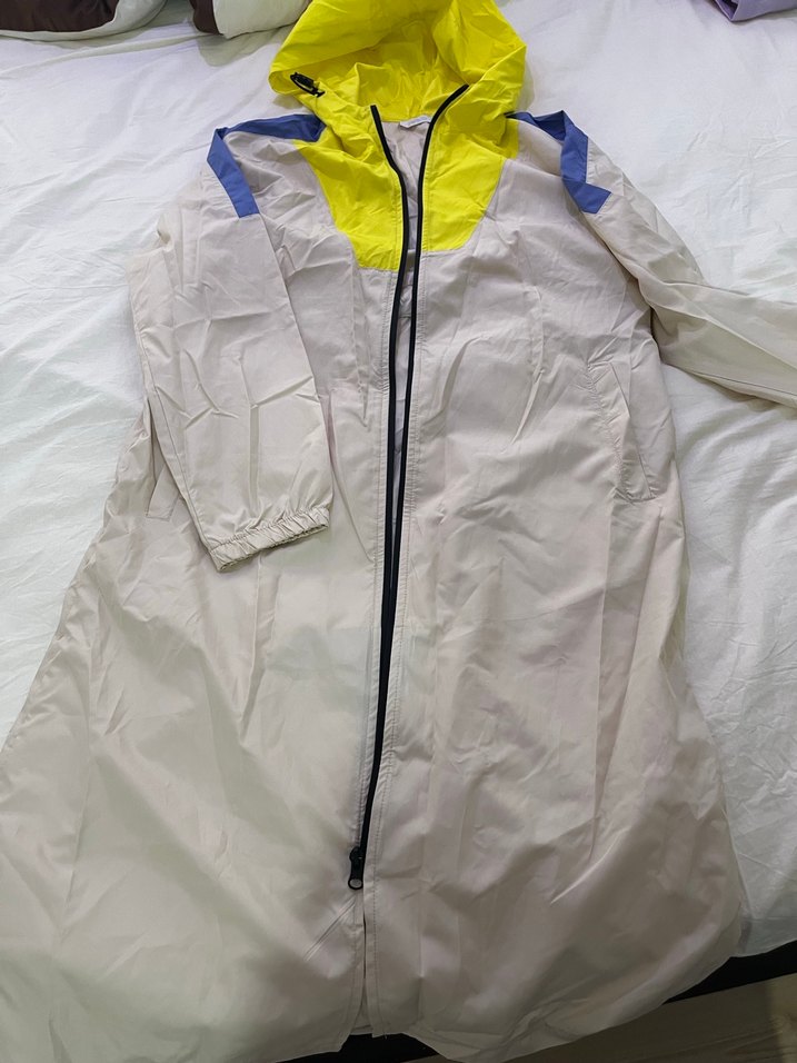 Uzun yağmurluk, fermuarlı kapama, yakası kesik ve uzun kolludur. Sentetik kumaştan, bol kesim ve canlı sarı kapüşonlu, içten ayarlanabilir beli