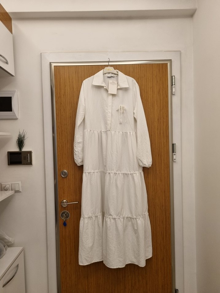 Beyaz uzun keten elbise, bol kesim, uzun kollu ve yakalıdır. Nakışlı detaylar ve fırfır süslemeleriyle bohem tarzını yansıtır.